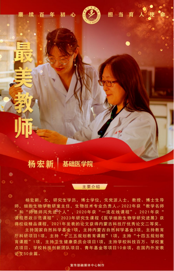 2004年硕士研究生毕业后的杨宏新教师,由临床工作转入基础医学的教学和科研工作。《医学细胞生物学》过去是选修课,学生重视程度不够,课程无法发挥基础向临床转化的作用,国内其他院校是必修课,“把课程建设成国内先进医学院校水平”成为她的梦想。为提高教师素质,她身先士卒,2013年入选自治区“511人才工程”,2014年远赴美国伊利诺伊大学进修学习,2015年毅然考取内蒙古农业大学发育生物学博士研究生,因为她深刻认识到现代学科发展需要交叉学科知识,医学细胞生物学不仅需要医学知识,更应该拓展发育生物学知识,这样才能给学生输送更广博的知识。