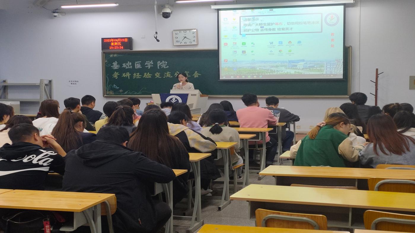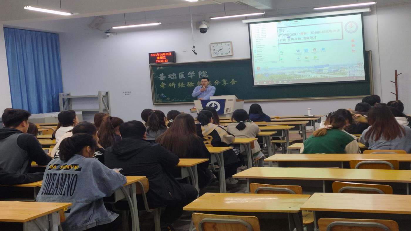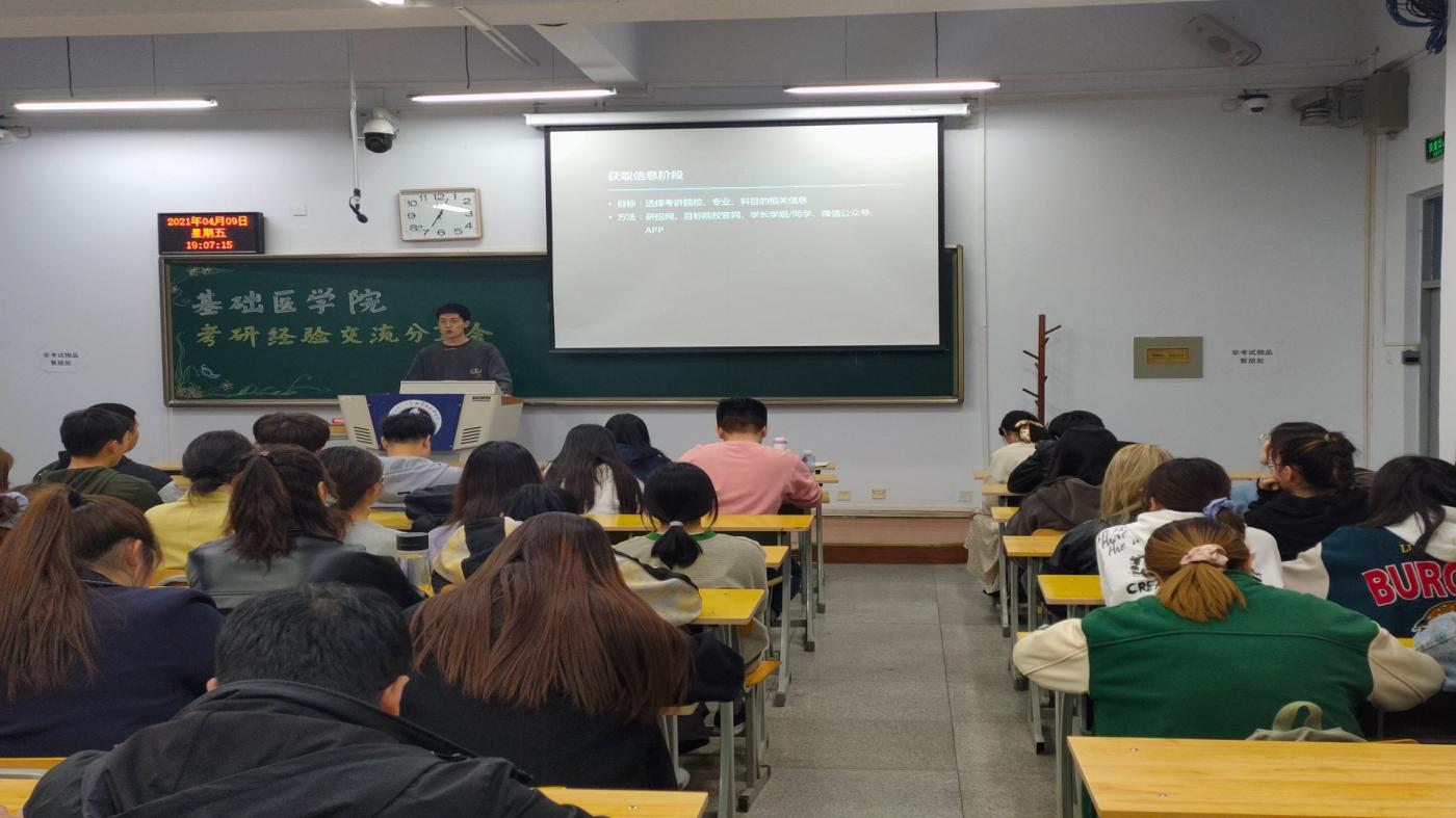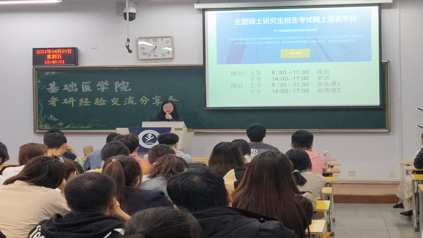 在当今大学生就业压力不断增大的前提下,大学生毕业时该不该选择考研,应该如何备考研究生,成为医学生发展道路上的一道难题。2021年4月9日晚,基础医学院研究生学生党支部、团总支,在金山校区教学南楼105教室举办考研经验交流分享会,学院2020级研究生为学院本科学生指点考研迷津。
